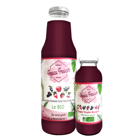 Cette recette tonifiante au goût délicat est élaborée à partir de petites baies rouges aux puissantes vertus antioxydantes : framboise, raisin, fraise, cerise, myrtille et aronia.